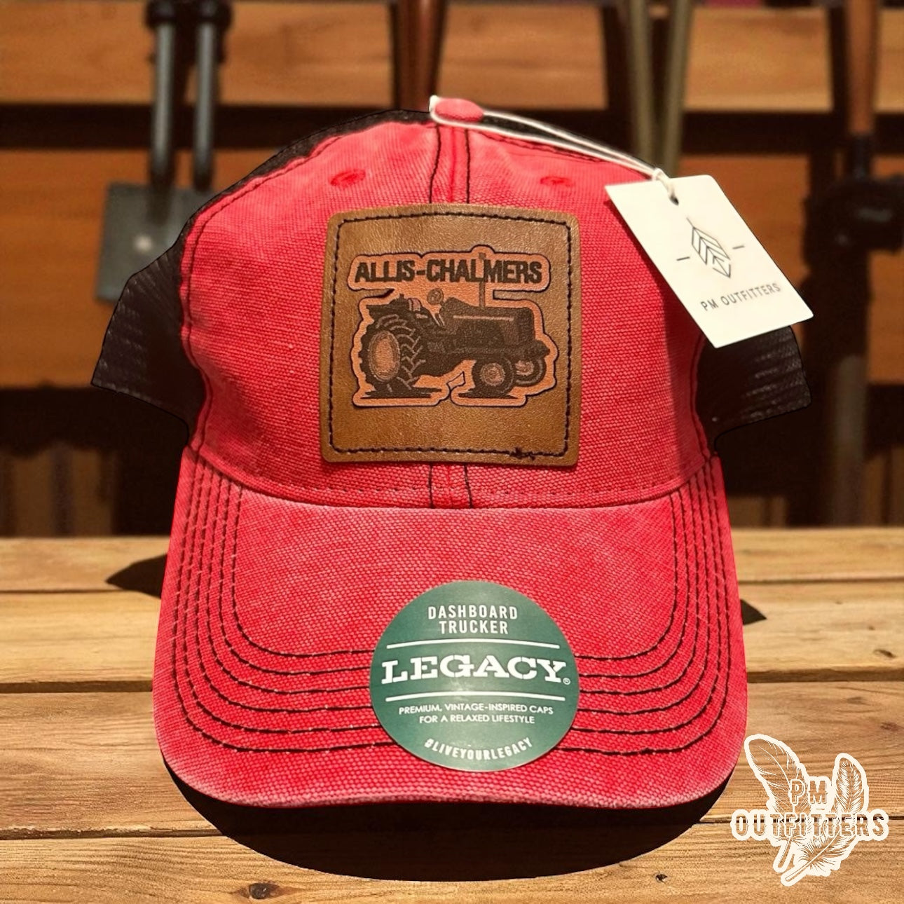 Introducing the Allis Chalmers Tractors Custom Vintage 2-tone Patch Trucker Hat. This exclusive hat features a signature 2-tone patch design on a red and black Legacy Dashboard Trucker Hat. Made with high-quality materials, this hat is perfect for any vintage tractor enthusiast, providing both style and comfort.