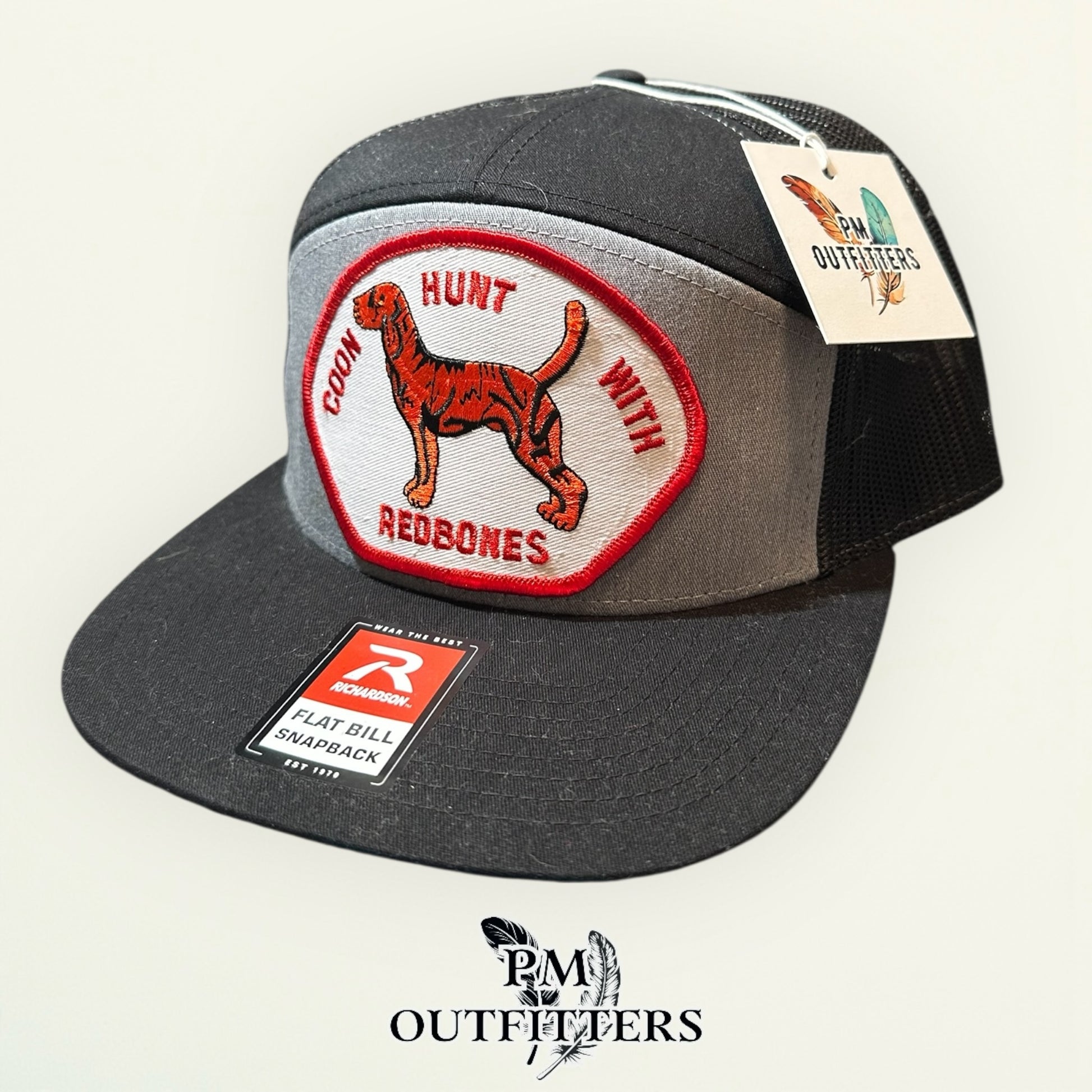 Coon Hunt With Redbones Trucker Hat — PM Outfitters Vintage Hunting Patch | Richardson 168 Grey Black Flat Bill