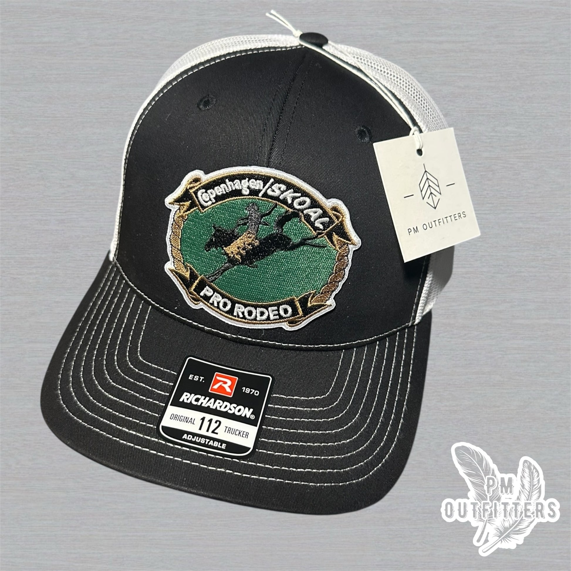 Introducing the Copenhagen/Skoal Pro Rodeo Vintage Patch Trucker, featuring a vintage embroidered patch on a stylish black and white Richardson 112 trucker hat. Perfect for fans of the rodeo, this hat adds a touch of nostalgia to any outfit. Get yours today and show off your love for the sport.