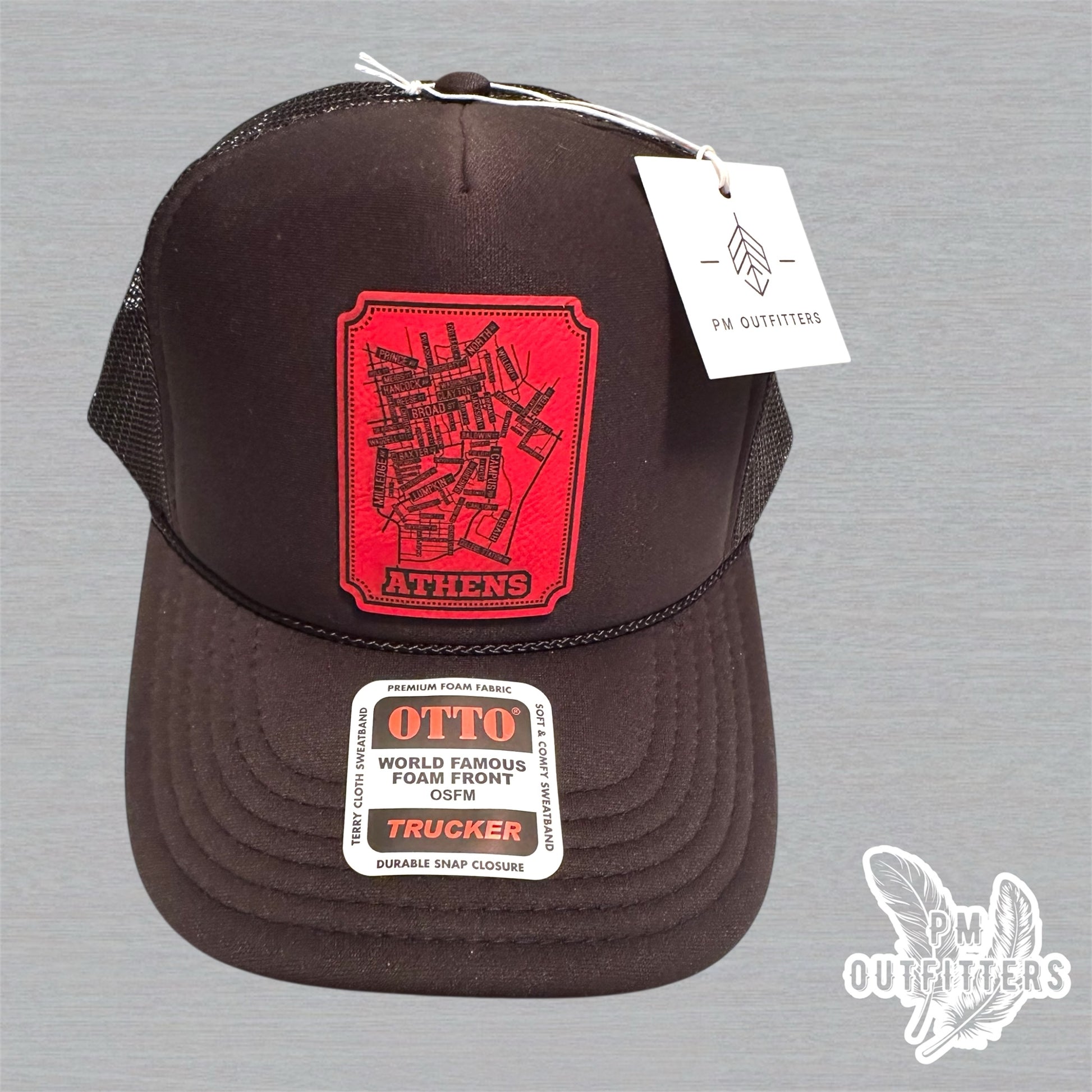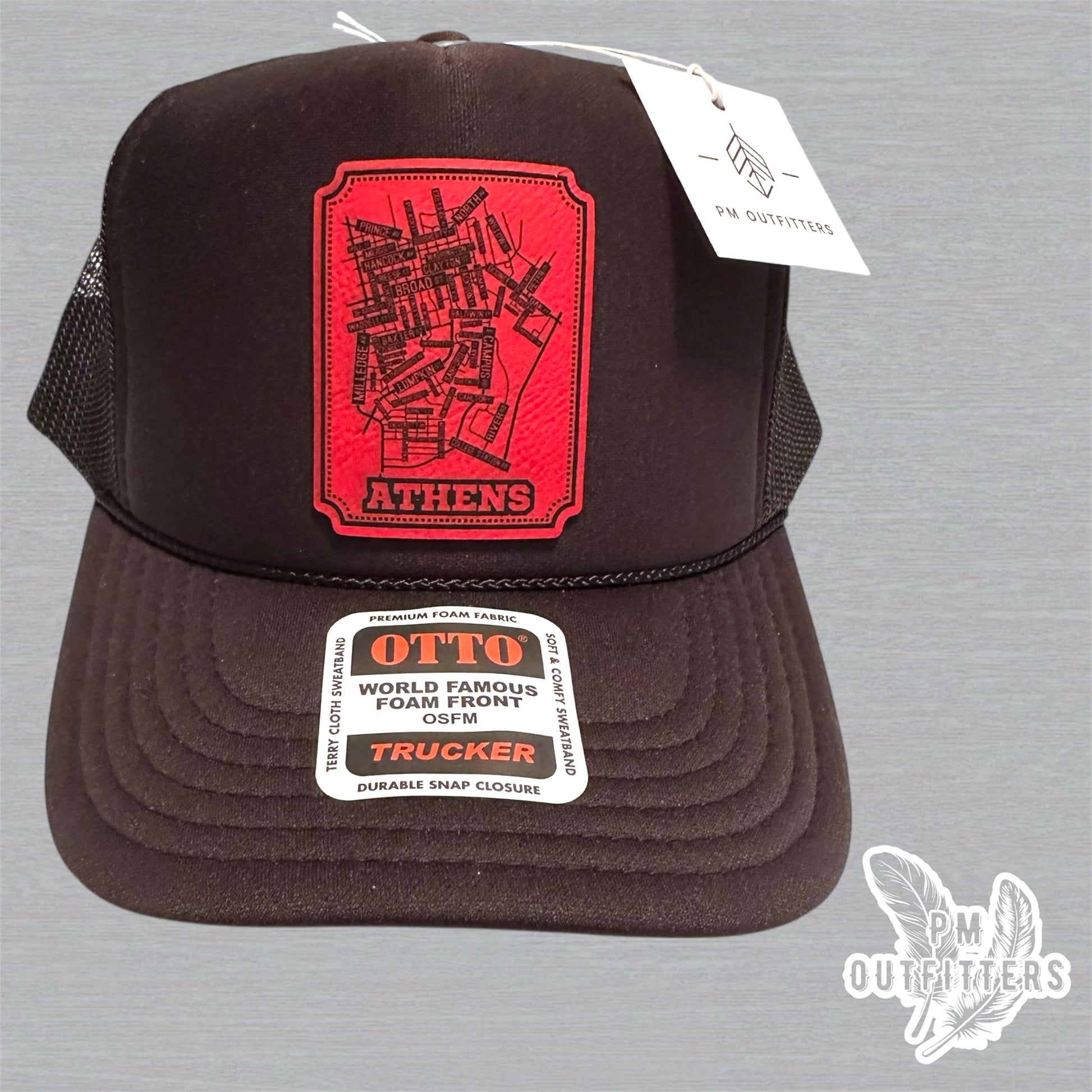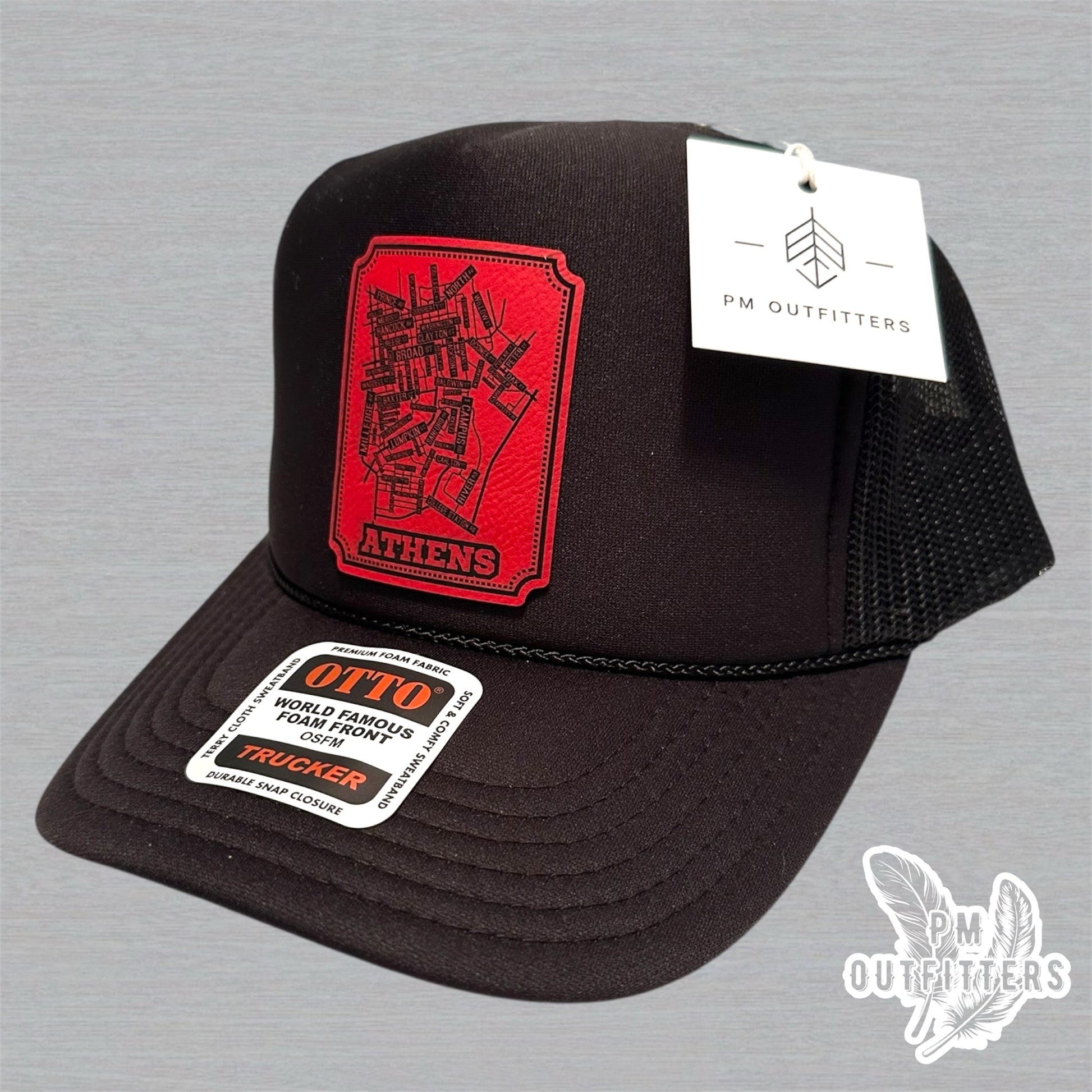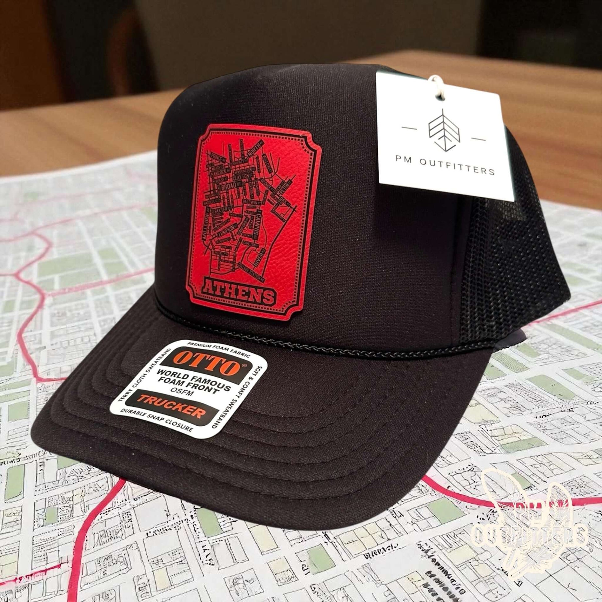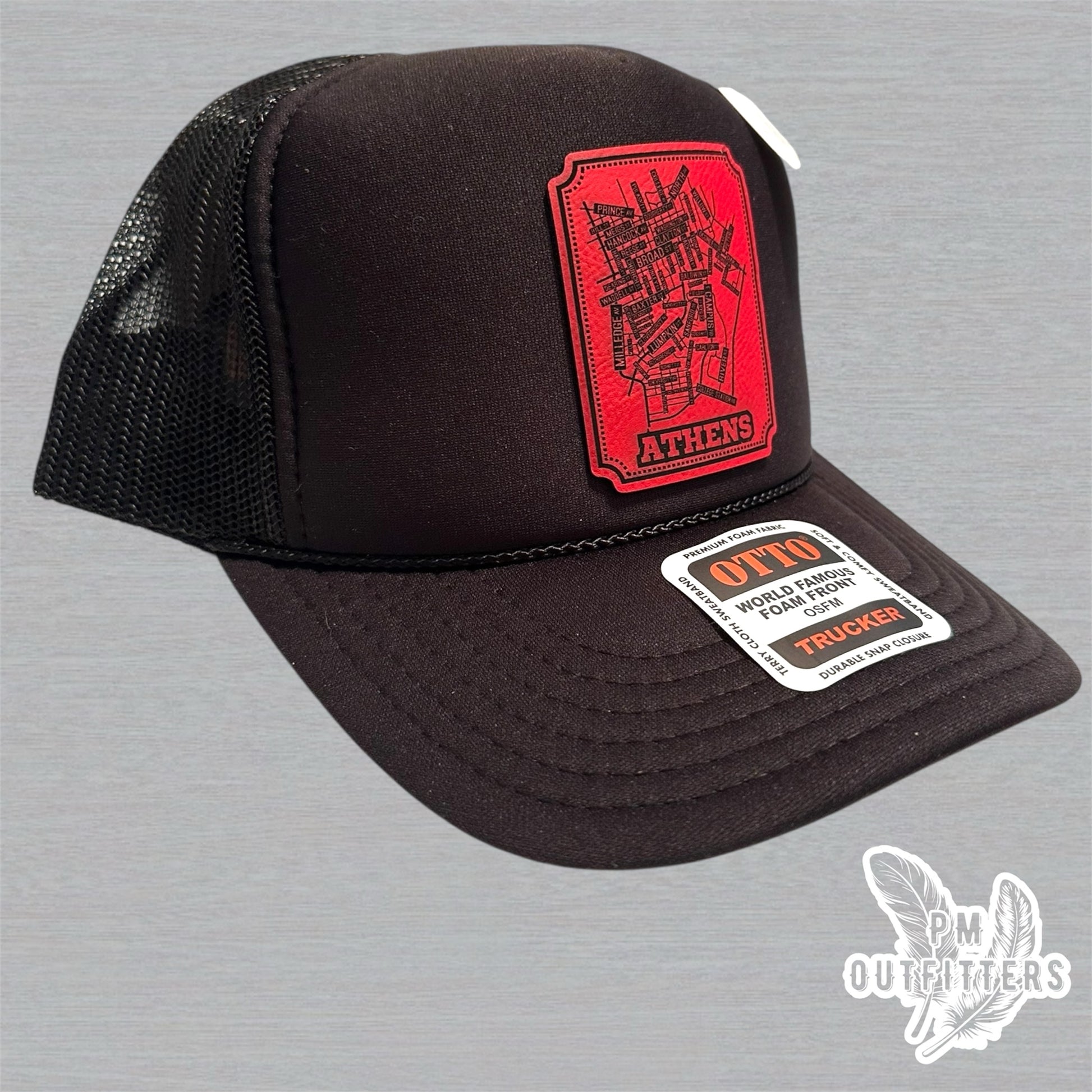 Show your Georgia pride with this custom Otto trucker hat featuring a red laser-engraved leatherette patch of the school street map of Athens, GA on a black foam front, mesh back classic snapback style—perfect for game days, tailgates, or everyday Bulldog spirit.