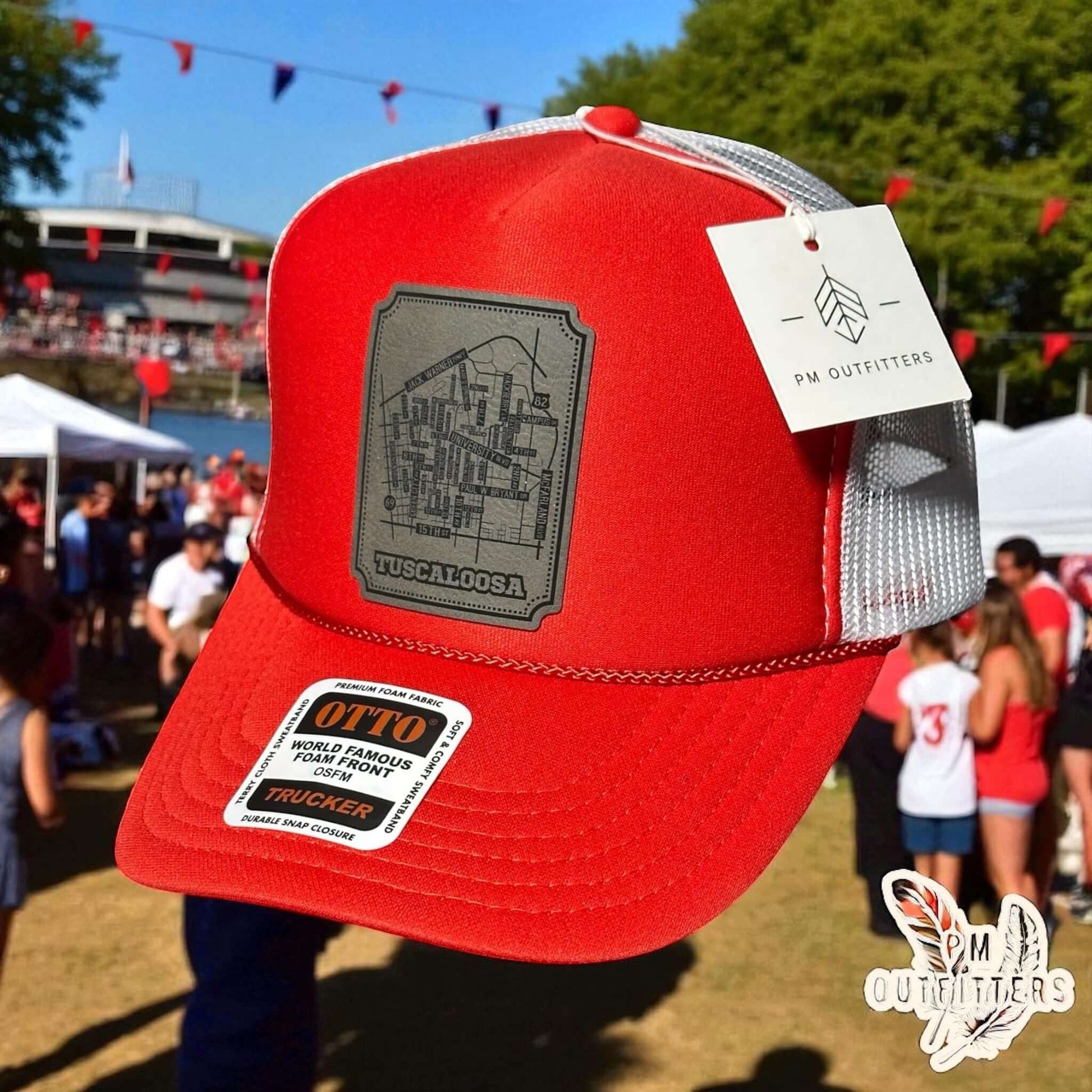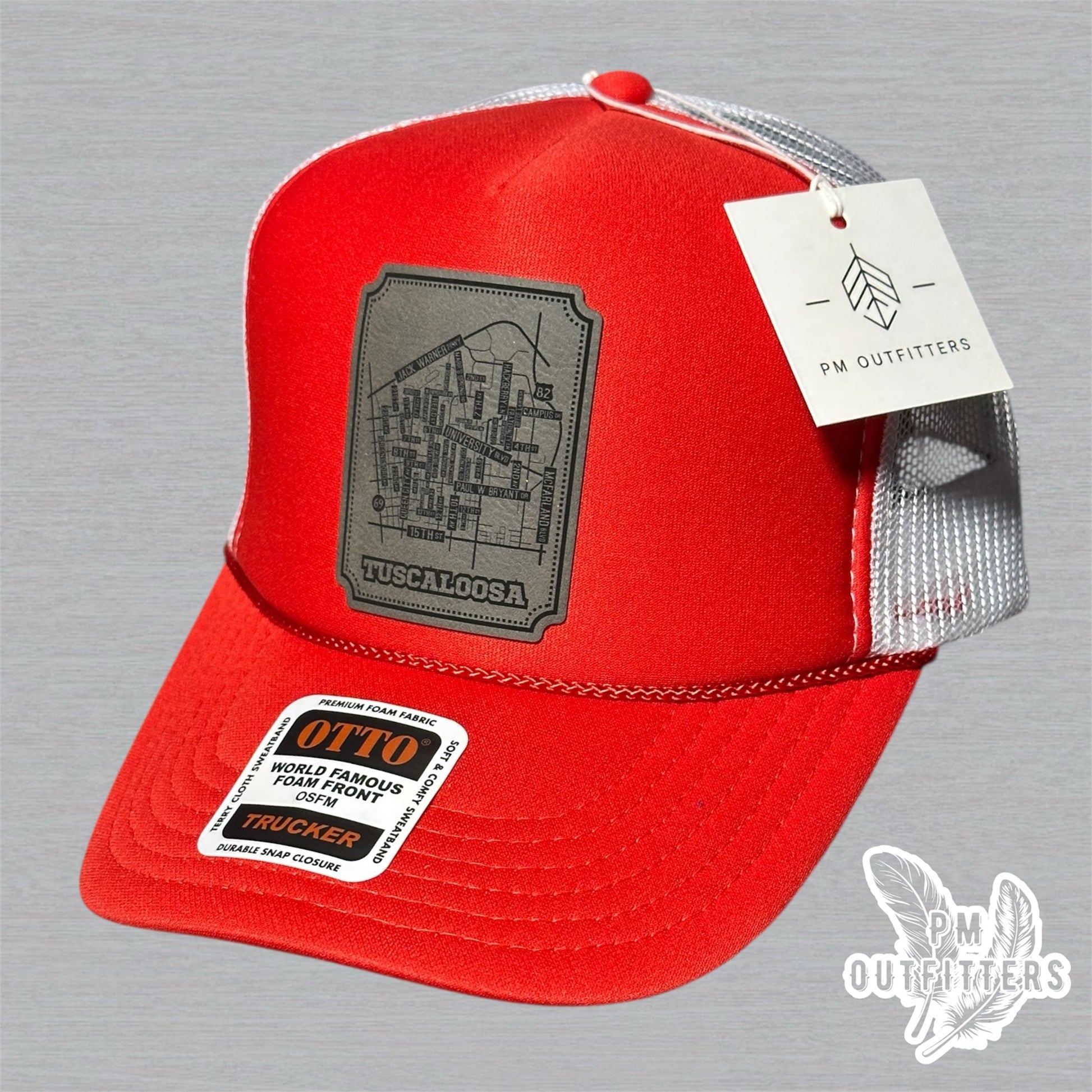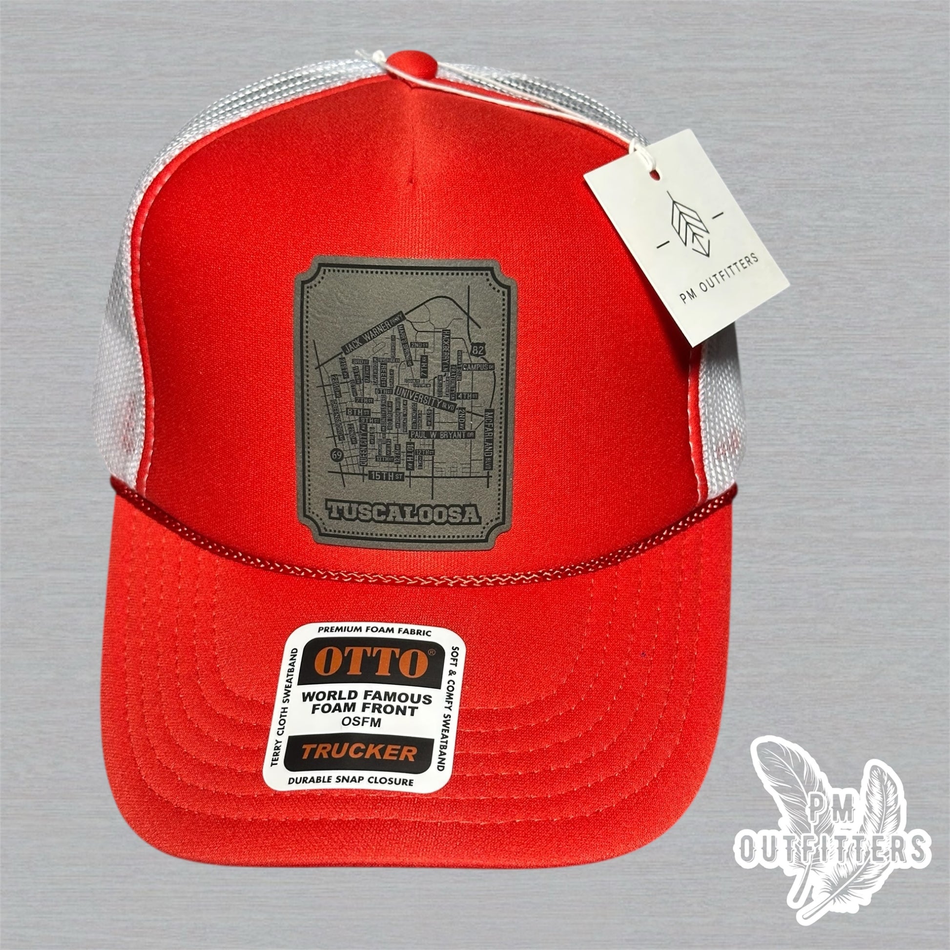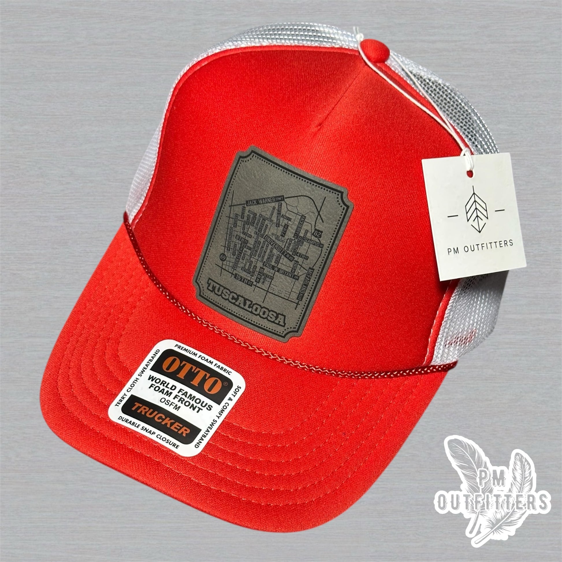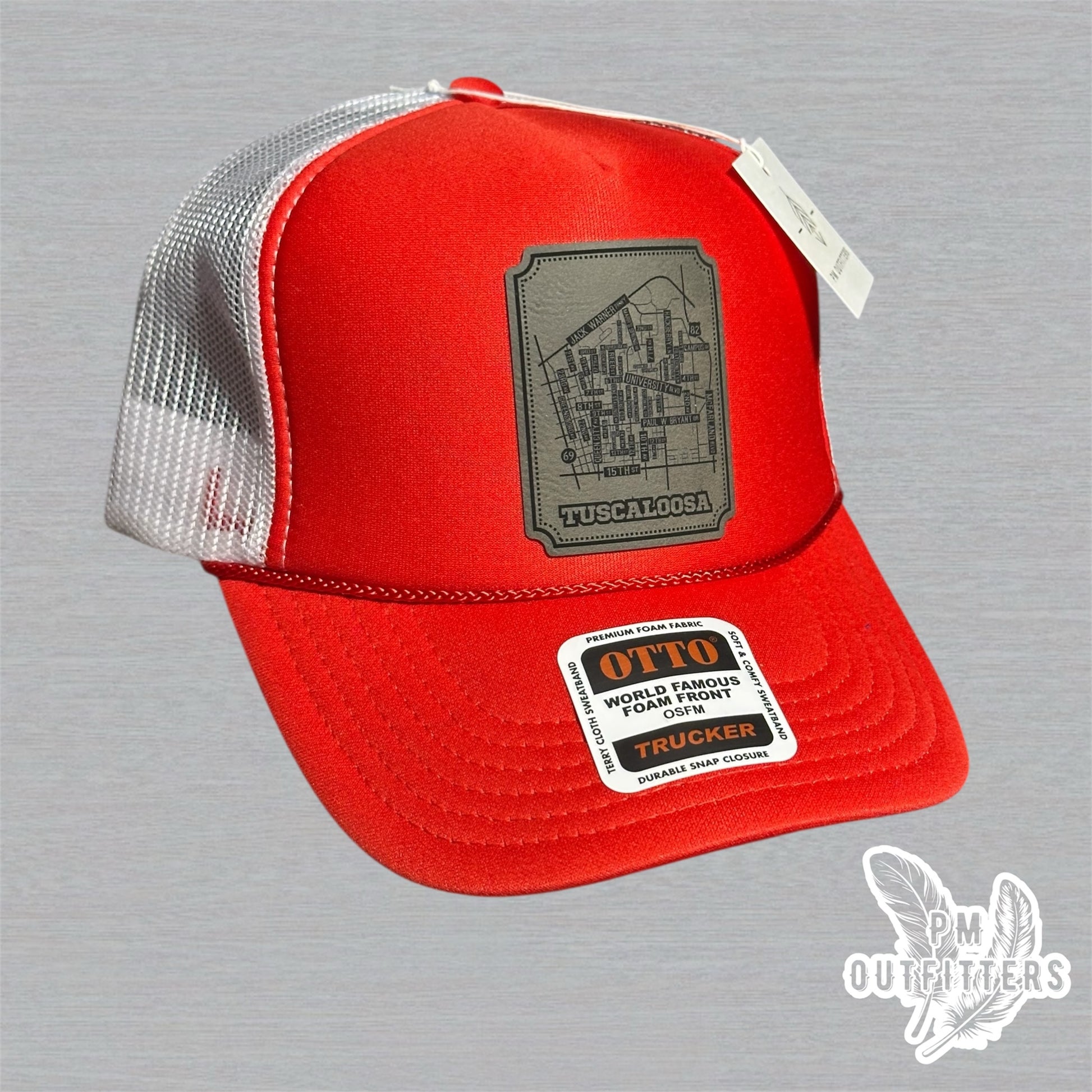 Show your Alabama pride with this custom Otto trucker hat featuring a gray laser-engraved leatherette patch of the school street map of Tuscaloosa, AL on a red and white foam front, mesh back classic snapback style—perfect for game days, tailgates, or everyday Tide spirit.