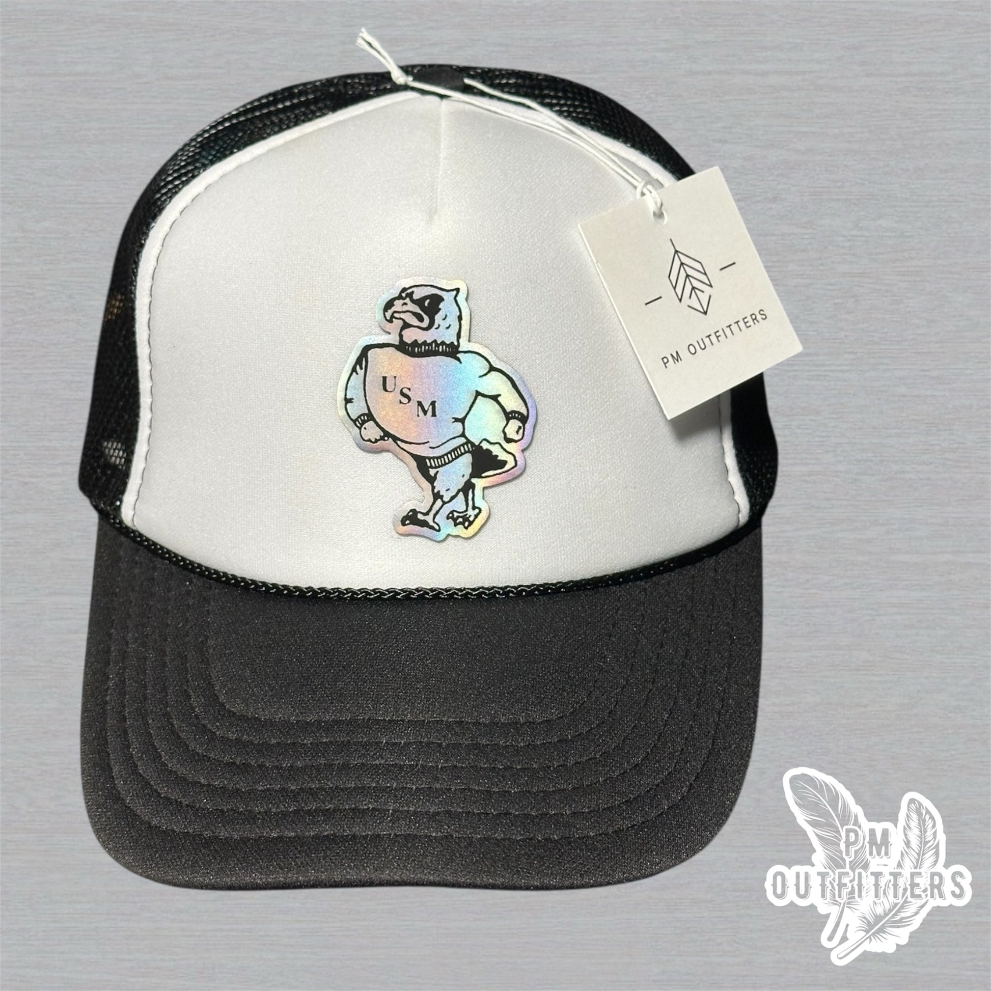 Stand out with this white and black Otto foam front rope trucker hat featuring a holographic Southern Miss Seymour leatherette patch. Classic fit, bold style — perfect for Golden Eagles fans.