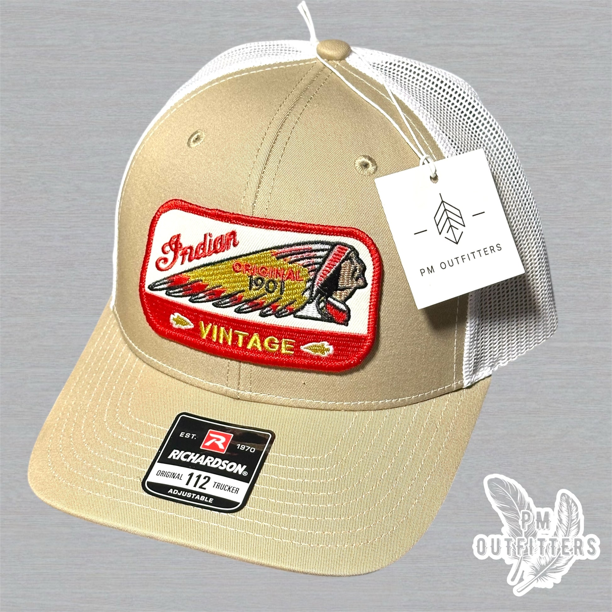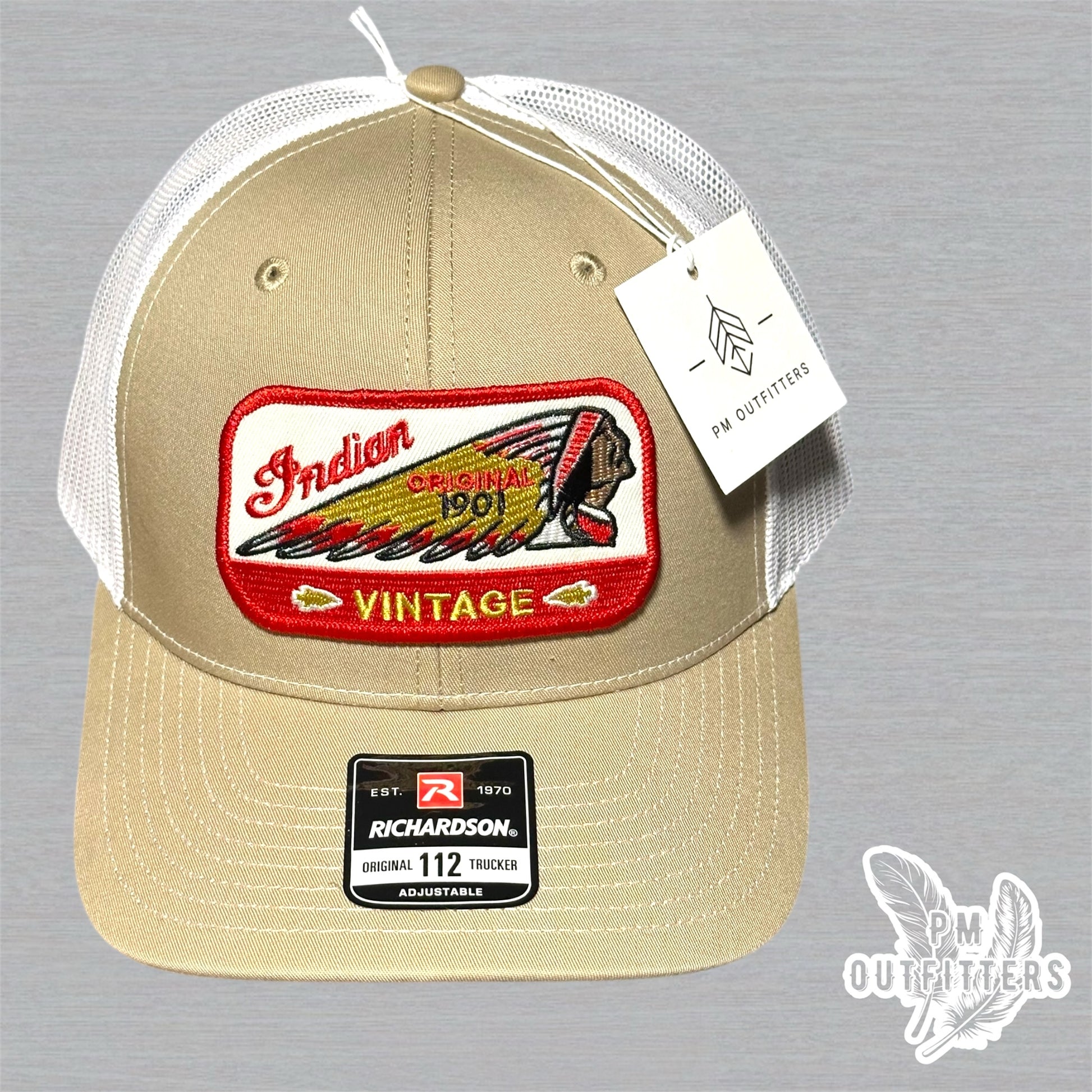 Khaki/white Richardson 112 trucker hat with embroidered Indian Motorcycle vintage patch. Retro style, adjustable snapback, perfect biker or collector cap.