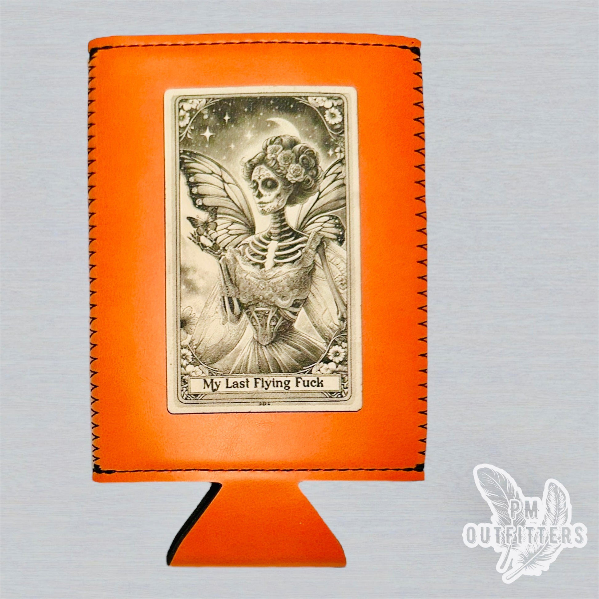 Boldly chill with the PM Outfitters orange leatherette slim can koozie featuring a laser-engraved “My Last Flying Fuck” tarot card design—attitude included.