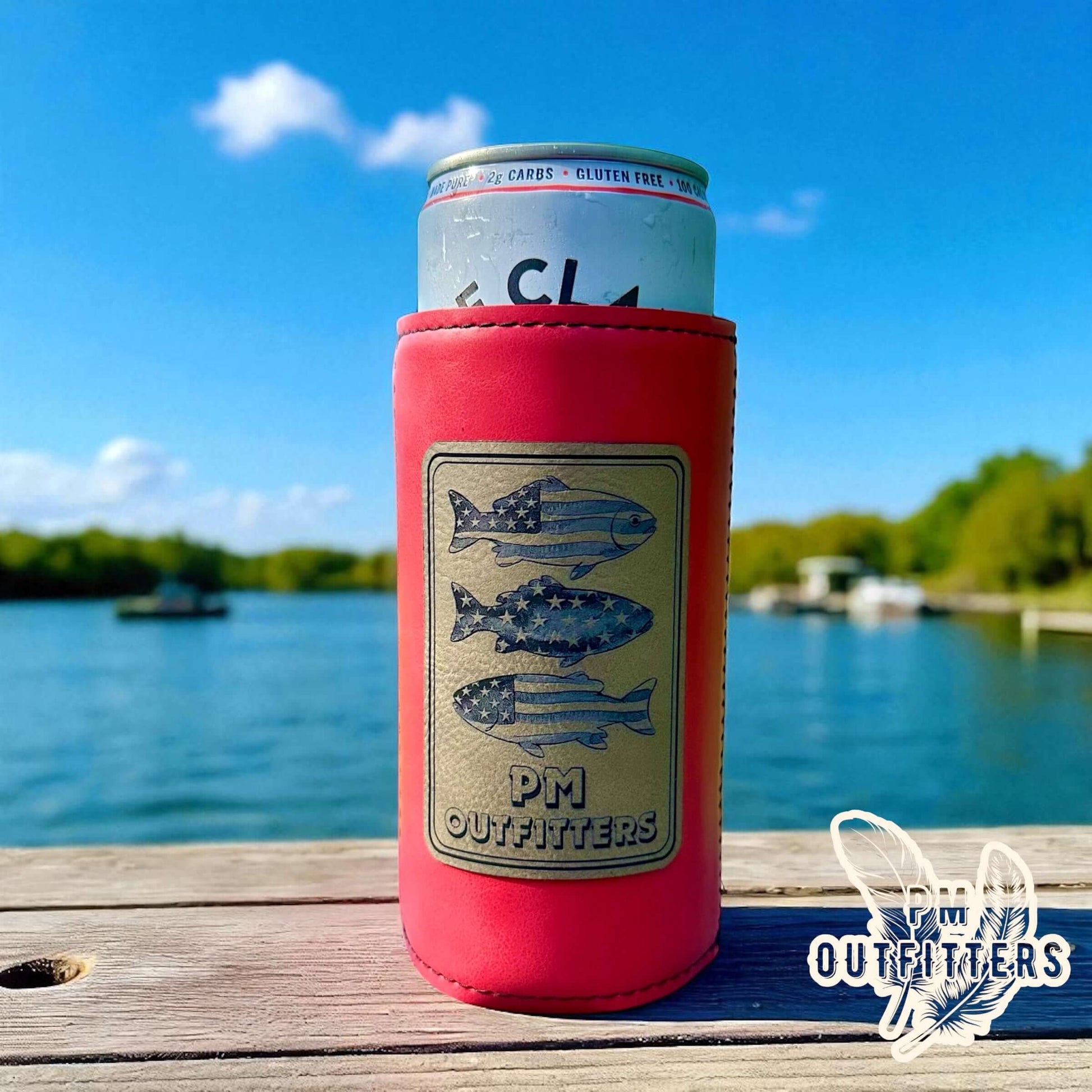 Add some patriotic flair to your drink with PM Outfitters' custom American flag 3-fish leatherette slim can koozie. Perfect for keeping your beverage cool and showing off your love for fishing and the USA. Cheers to style and functionality!