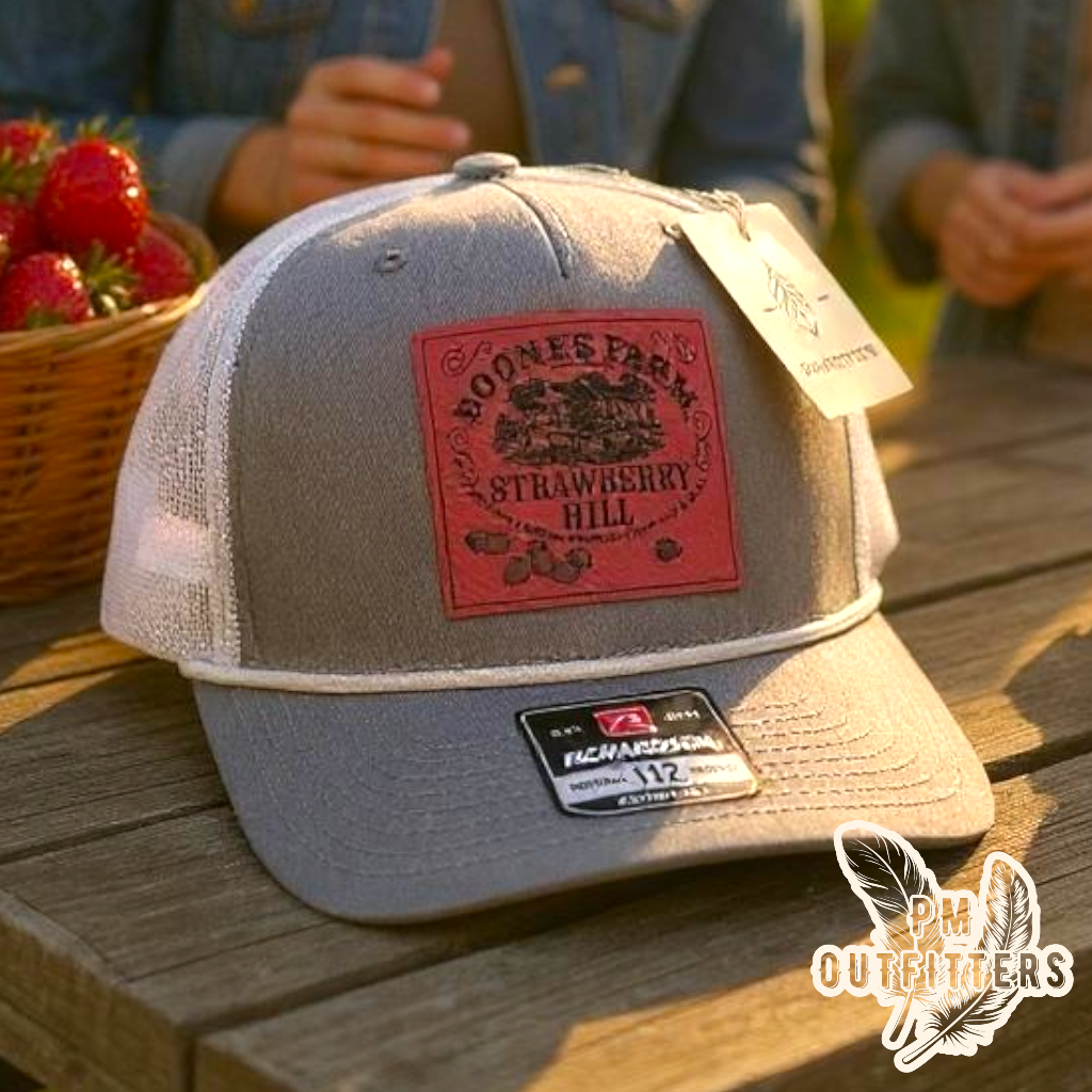 Add a touch of nostalgia to your vibes with our Retro Boone's Farm Trucker Hat. Custom engraved with a leatherette patch featuring the iconic Strawberry Hill flavor, this Richardson 112 rope hat is perfect for any fan of the classic “adult” beverage. Keep the good times rolling (and reminisce about your younger years) with this unique and stylish accessory.