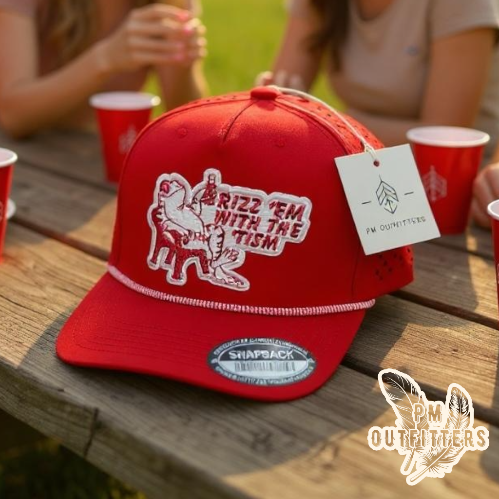 Get ready to make a statement with our Rizz ‘Em With The ‘Tism Patch red and white snapback! This Dallas 804 Hydro Waterproof Rope Trucker will keep you stylish and dry. Plus, the unique patch adds a touch of humor and personality to any outfit. Get yours today!