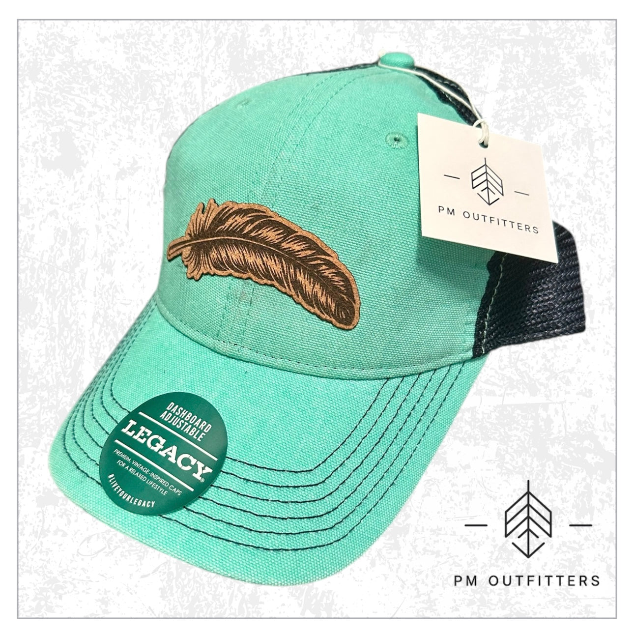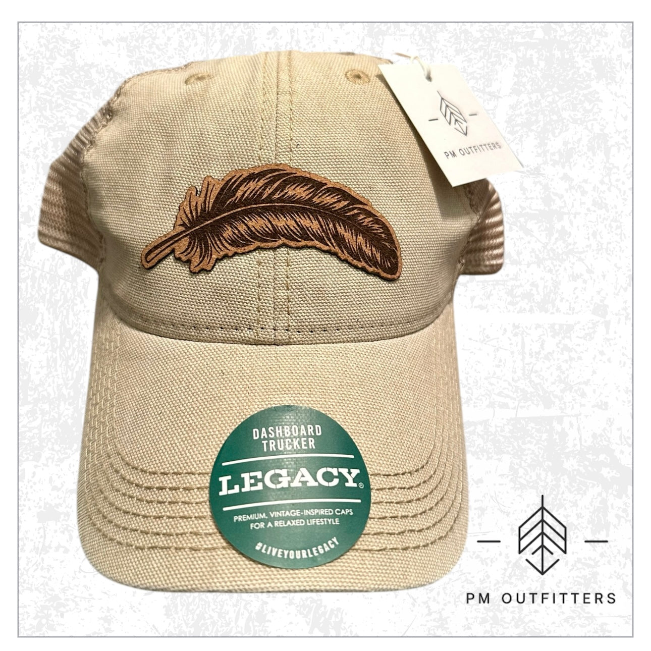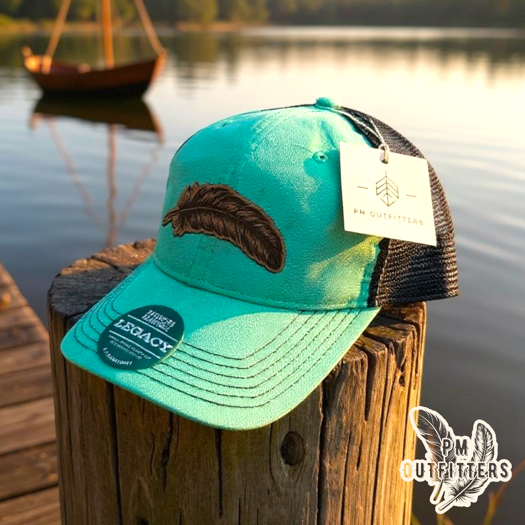 Introducing the Signature Feather Cork Leatherette Trucker Series from PM Outfitters. Our custom engraved feather logo is featured on a unique cork designed leatherette, adding a touch of sophistication to a Legacy low-profile trucker hat. Stand out in style and comfort with this must-have accessory. Perfect for summer, boat and beach days.