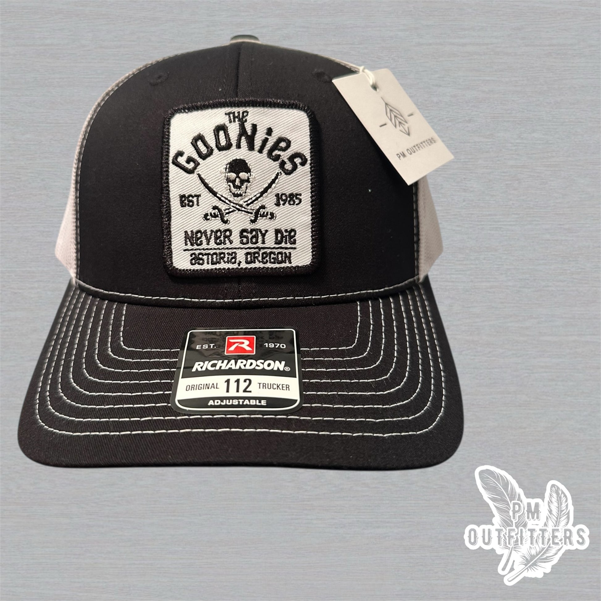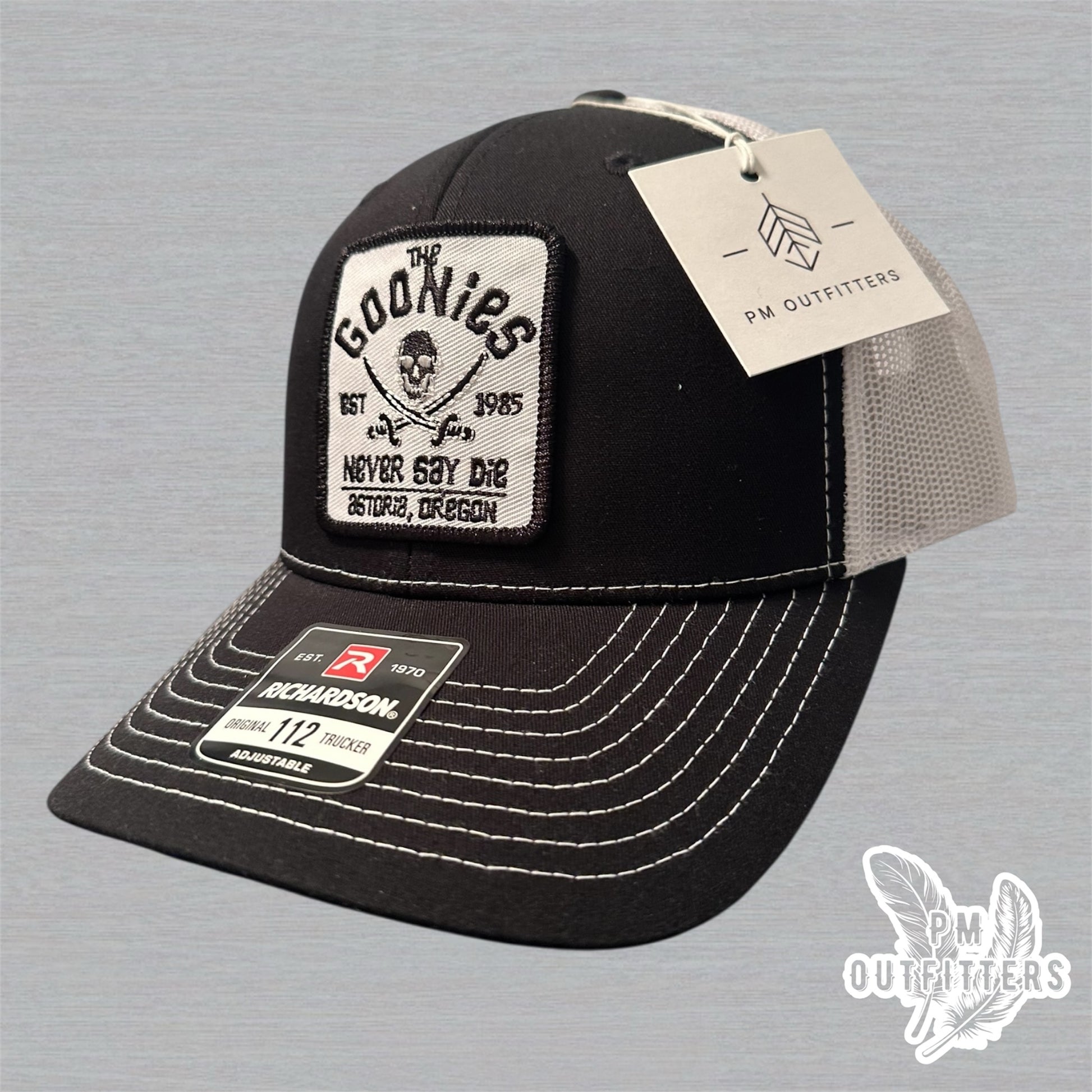 The Goonies Never Say Die patch on a Richardson 112 trucker hat—retro adventure vibes meet classic style. Perfect for movie fans and collectors!
