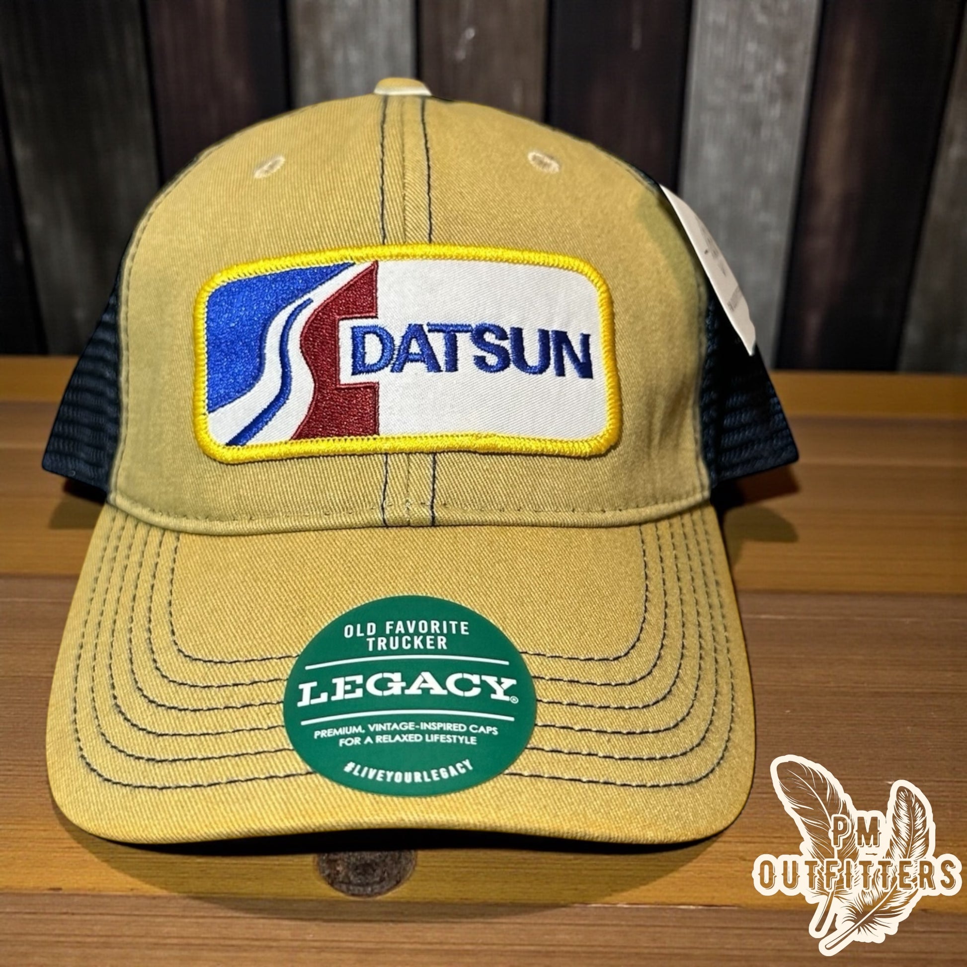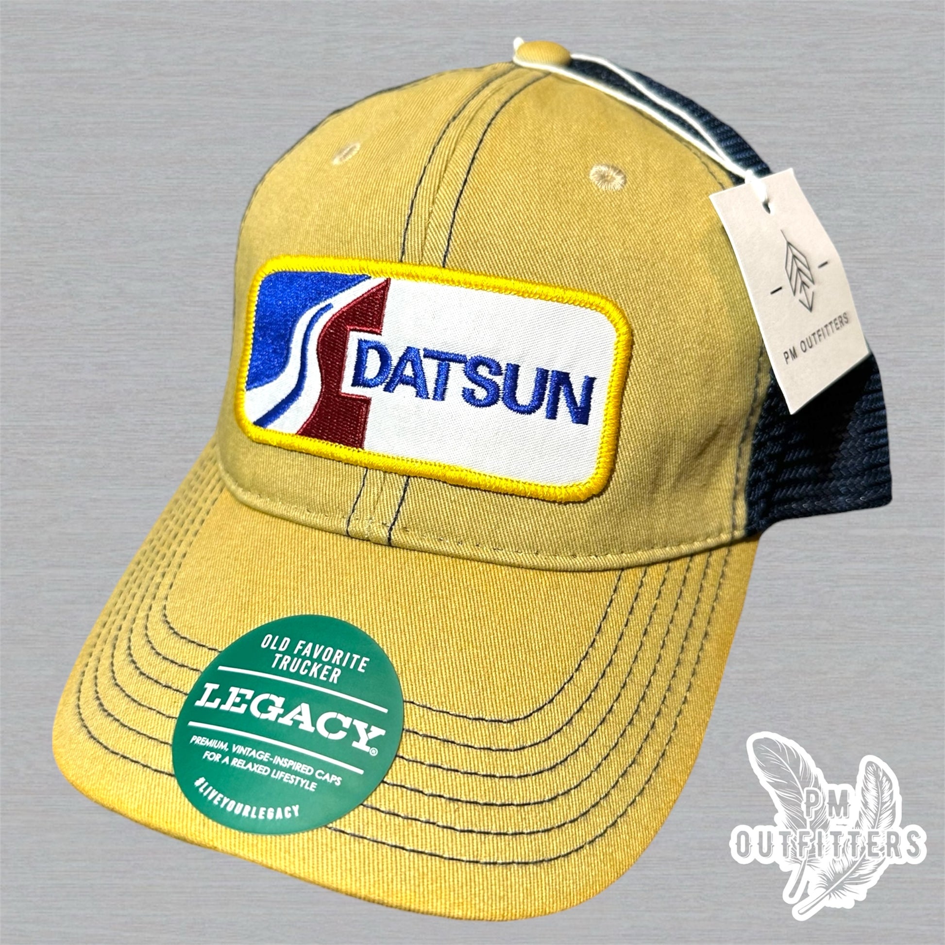 This hat is for you. It’s Legacy Old Favorite vintage construction with authentic Datsun styling in classic tan and navy.