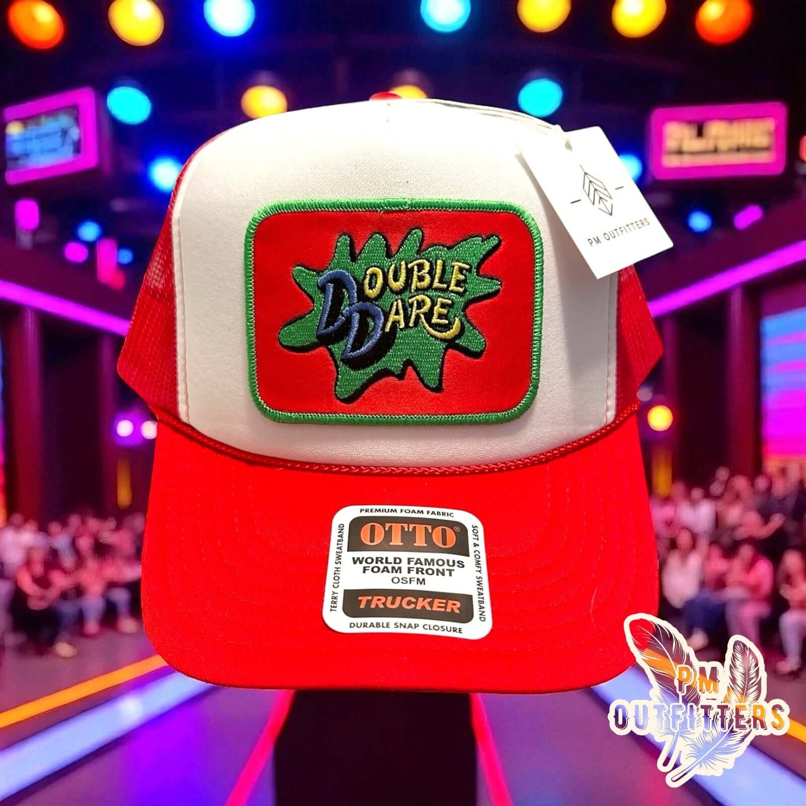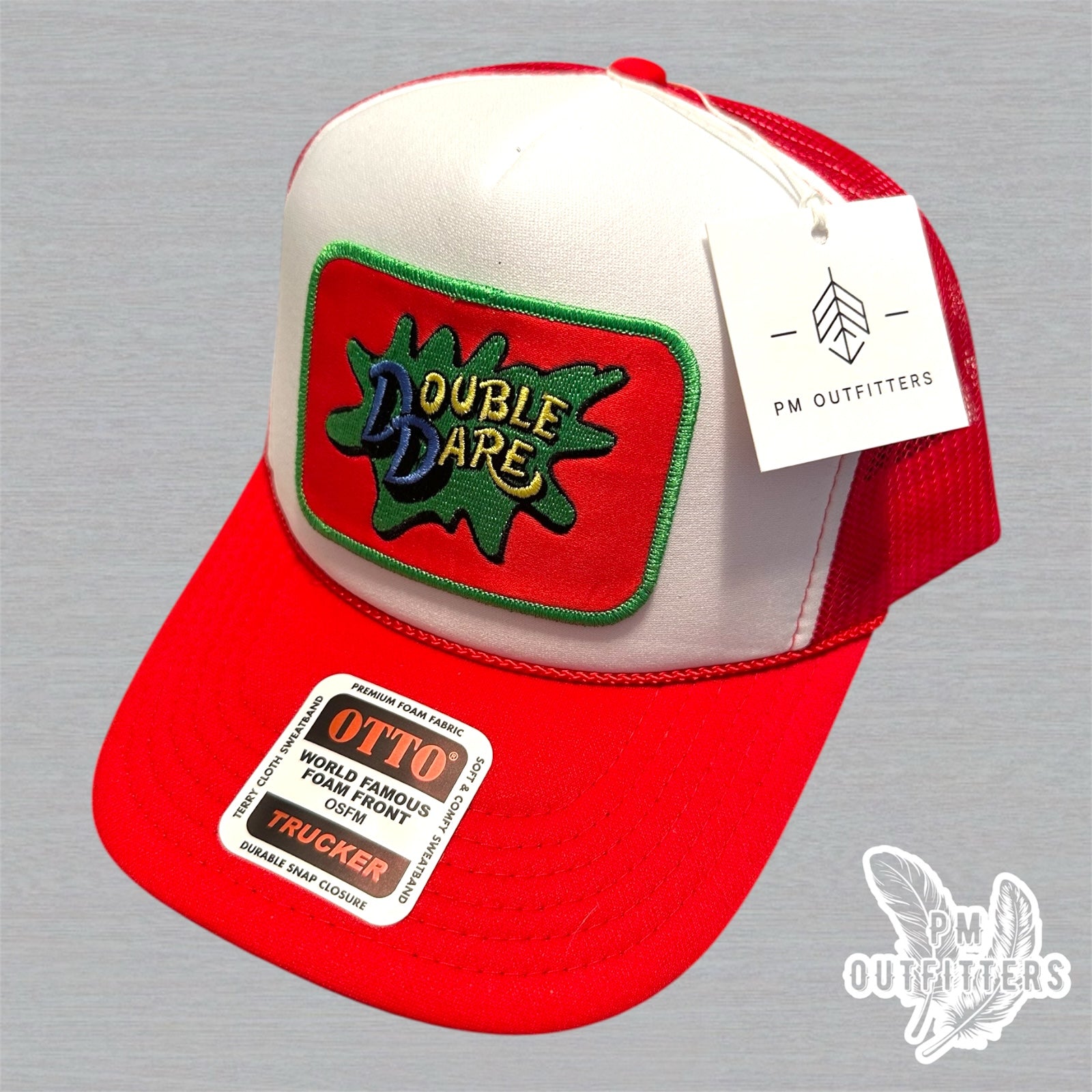 Vintage Double Dare Nickelodeon patch hat on Otto 39-165 trucker cap with foam front, mesh back, rope detail—perfect for retro fans and collectors.